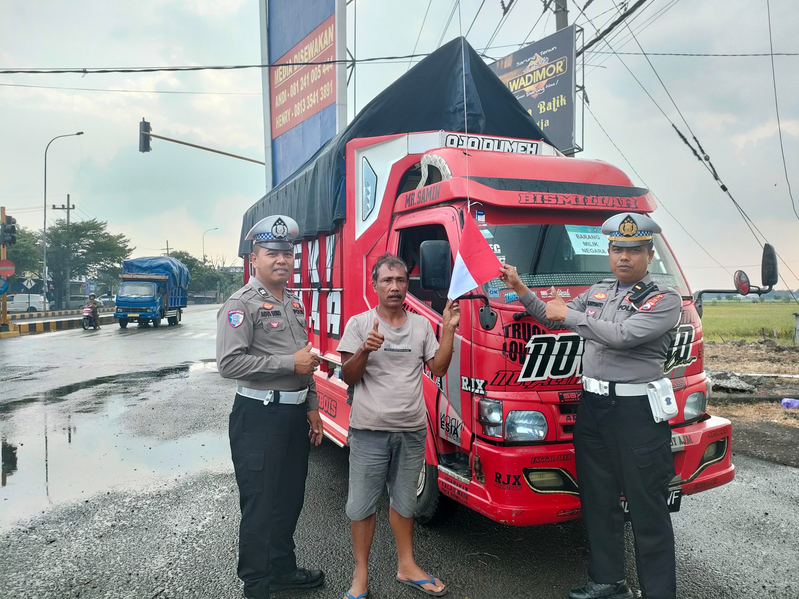 Seperti yang dilakukan oleh anggota Satuan Lalu Lintas Polres Ngawi Polda Jatim, dipimpin Kasat Lantas AKP Yuliana Plantika yang membagikan bendera merah putih dan memasangnya pada kendaraan-kendaraan yang melintas di jalan raya, pada Selasa (5/8/2025)