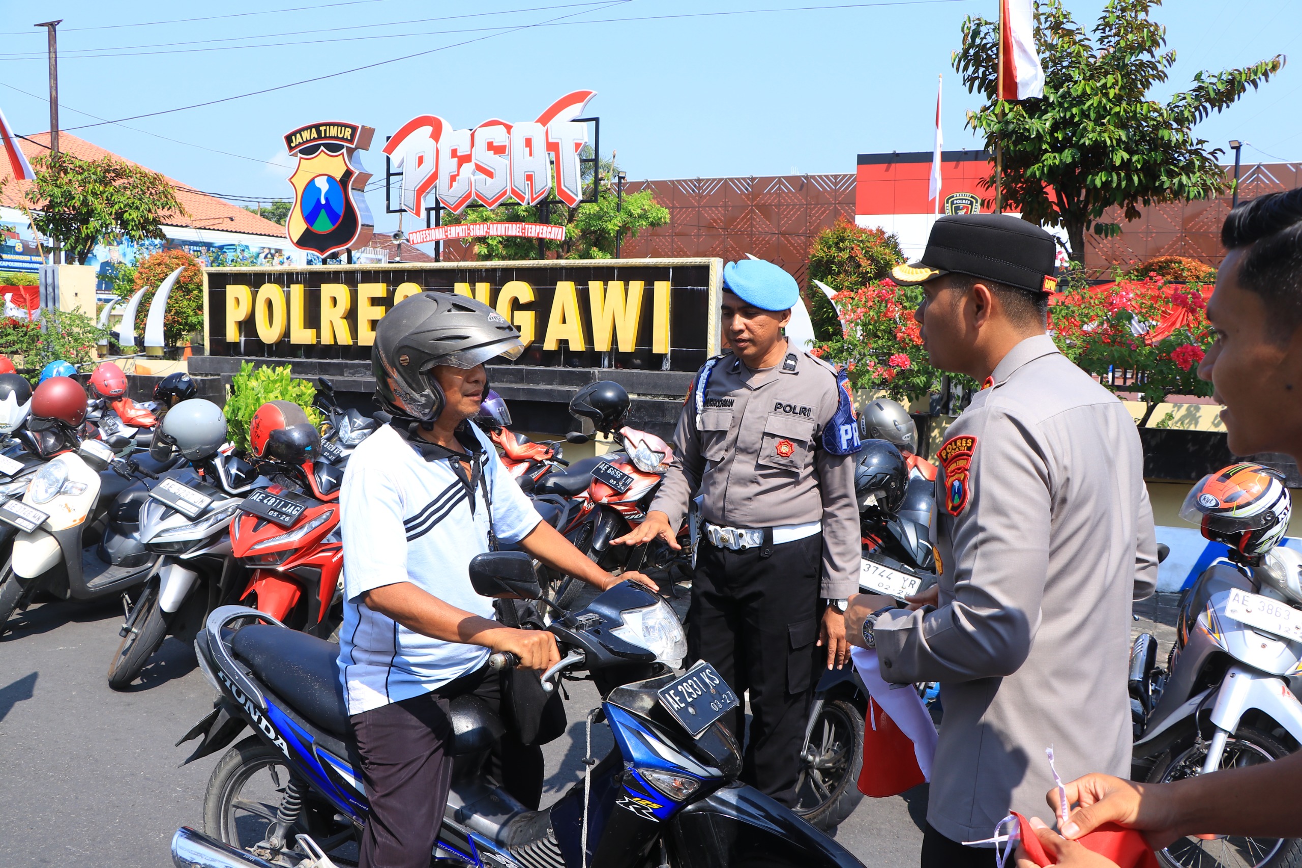 Dengan penuh semangat, Kapolres bersama sejumlah personel Polres Ngawi langsung turun ke jalan menyapa pengendara, membagikan bendera, dan membantu memasangkannya di kendaraan.