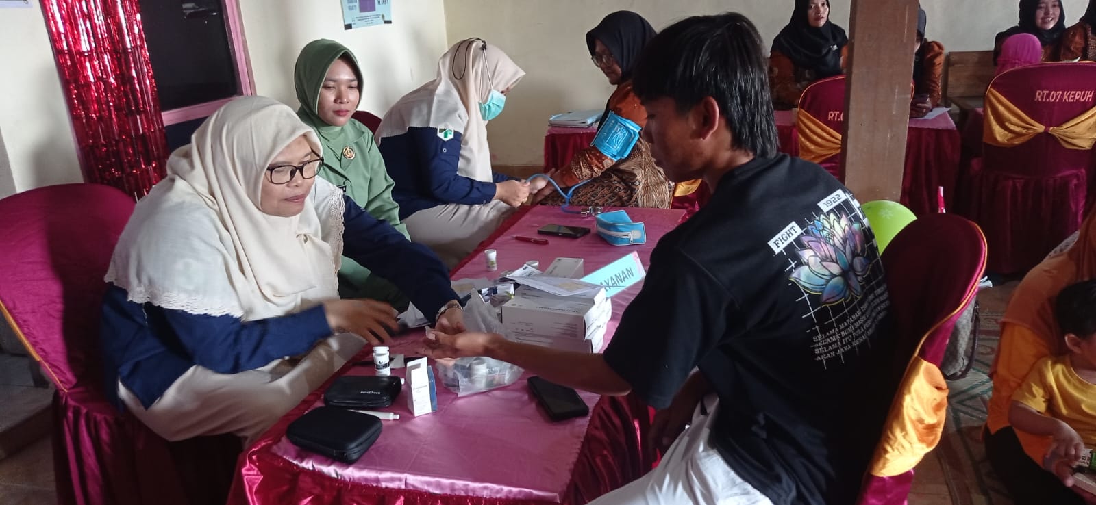 Sejak pagi, para ibu datang dengan menggendong atau menuntun buah hati mereka untuk diperiksa kesehatannya. Penimbangan berat badan, pemberian vitamin, hingga imunisasi dilakukan dengan teliti. Para lansia pun hadir, mendapatkan pemeriksaan tekanan darah dan konsultasi kesehatan sederhana. Semua berlangsung dalam suasana akrab, dibantu oleh tenaga kesehatan desa dan kader posyandu setempat yang penuh perhatian.