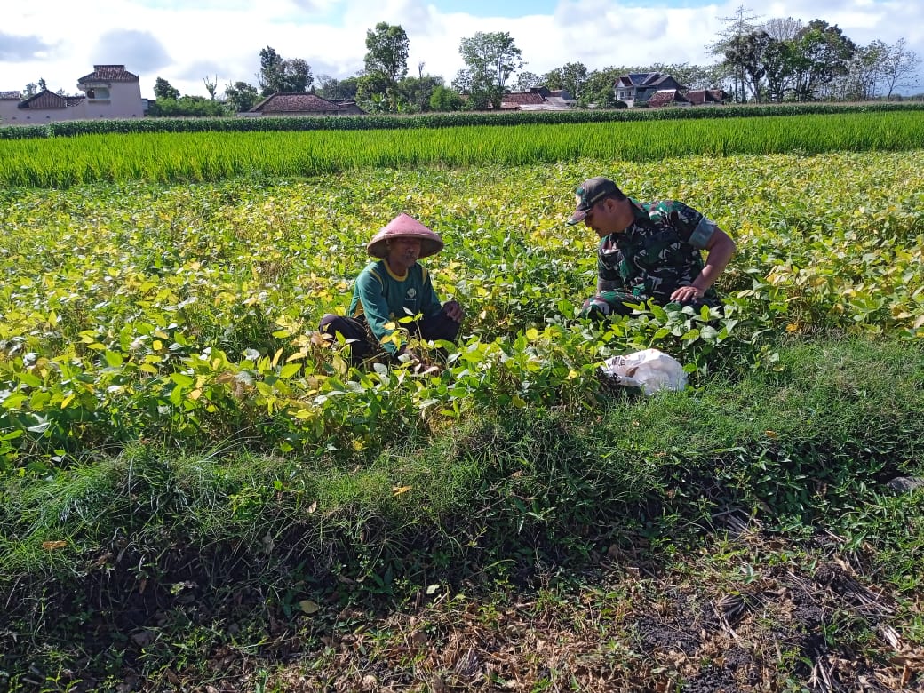 “ Hari ini saya bersama Pak Sodikan salah satu petani yang tergabung dalam Poktan Tani Mulyo Desa Pijeran yang sedang merawat atau mengecek tanaman kedelai di lahan seluas 2 kotak, “ kata Sertu Muhsin Abrori.