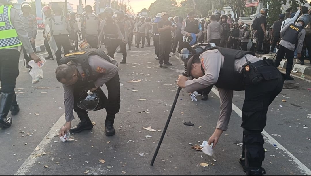Sejumlah personel Polri terlihat memungut botol plastik, kertas, dan berbagai jenis sampah sisa-sisa momen unjuk rasa. Mereka juga menyapu sampah-sampah yang berserakan di beberapa titik, warga pun turut membantu.