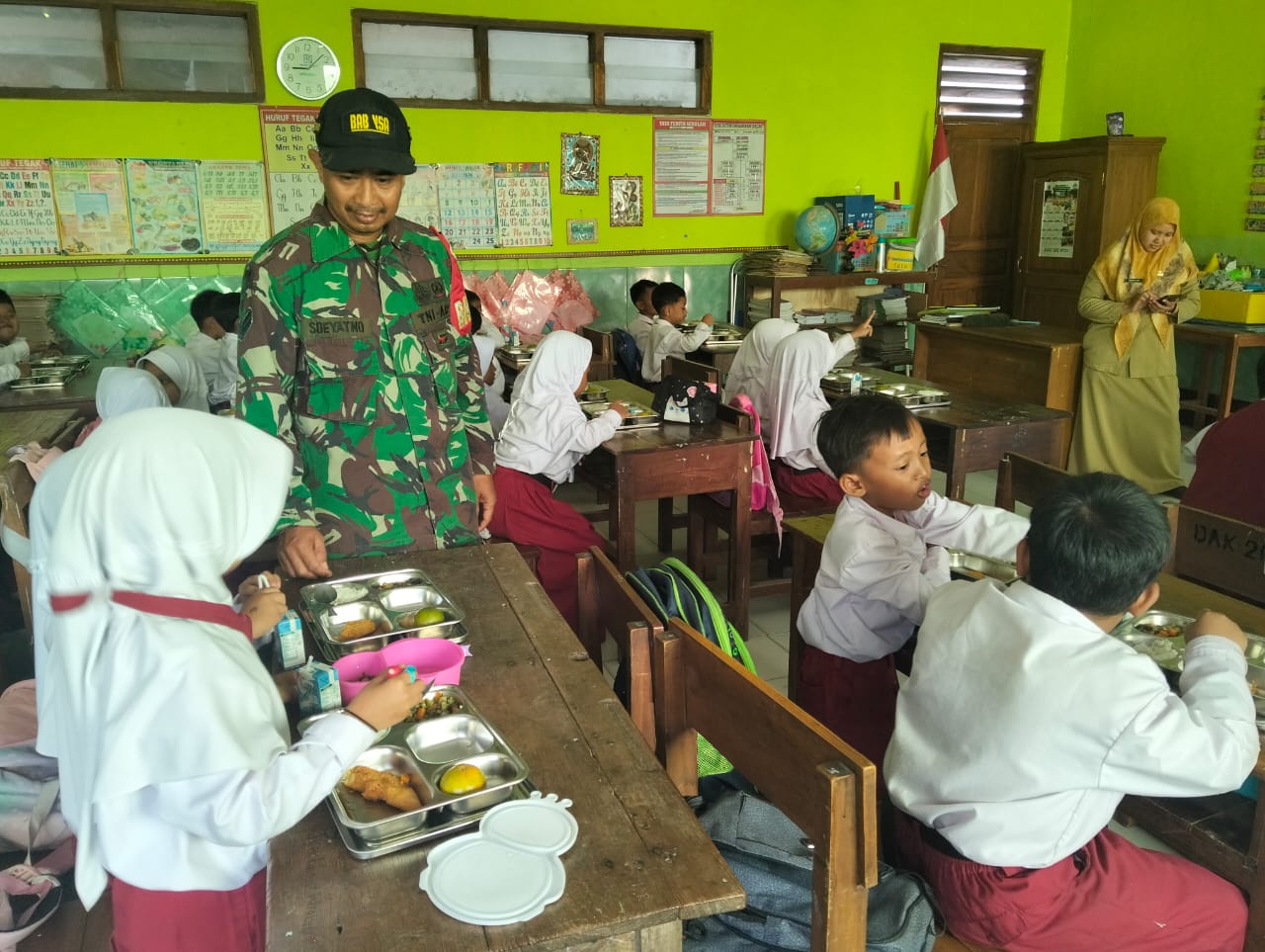 NGAWI, BUSERJATIM.COM GROUP – Babinsa 0805/09 Kendal Kodim 0805 Ngawi Sertu Suyatno melakukan pendampingan pembagian program Makan Bergizi Gratis (MBG) di SDN Kendal 1 Kec.Kendal ,Rabu (24/09/2025).