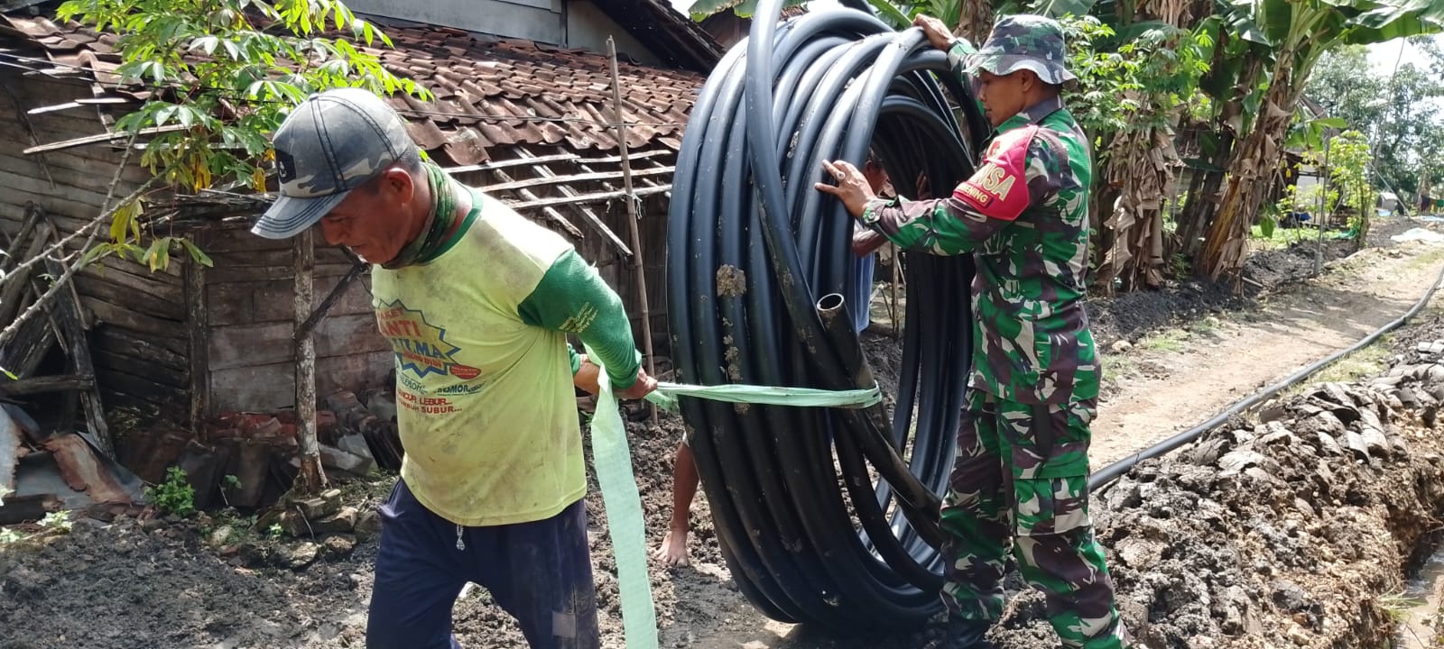 Dalam kesempatan itu, Babinsa dan masyarakat bahu membahu bergotong royong membuat pondasi talut pengairan persawahan dan pemasangan pipa air bersih untuk keperluan sehari-hari warga tersebut.
