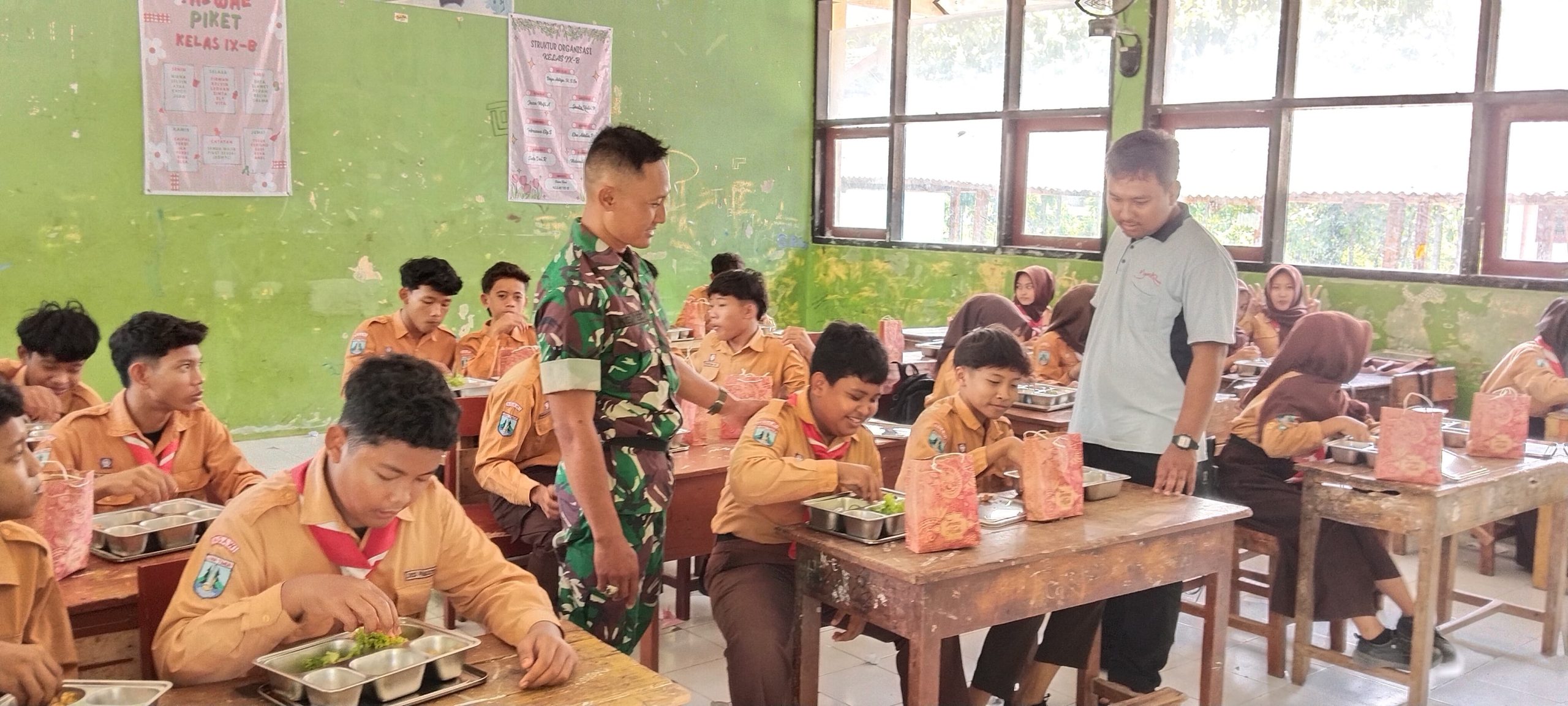 NGAWI, BUSERJATIM.COM GROUP – Dukung program makan bergizi gratis bagi anak sekolah di wilayah kecamatan Bringin. Babinsa Koramil 14/Bringin, Kodim 0805/Ngawi Sertu Suyono berserta anggota lainya dampingi dan membantu pelaksanaan program tersebut di SDN 1 Bringin, Ini sebagai bentuk dukungan terhadap program pemerintah dalam meningkatkan kesehatan dan kesejahteraan masyarakat, khususnya siswa-siswi di sekolah. Senin (27/10/2025).