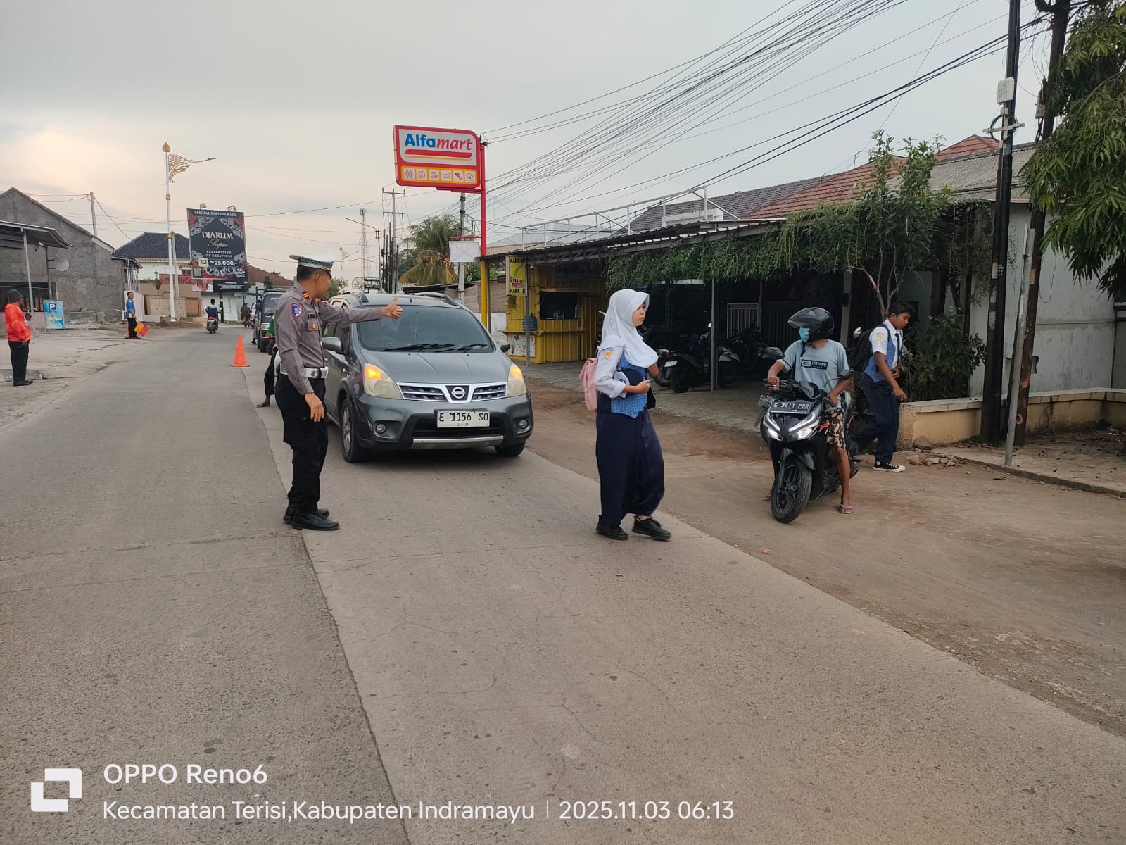 Indramayu – Demi menciptakan rasa aman dan tertib bagi para pengguna jalan, khususnya pelajar, personel Polsek Terisi Polres Indramayu Polda Jabar melaksanakan pengaturan lalu lintas pagi di titik rawan kemacetan dan kecelakaan. Kegiatan ini berlangsung di depan SMPN 1 Terisi, Kecamatan Terisi, Kabupaten Indramayu. Senin pagi (3/11/2025)