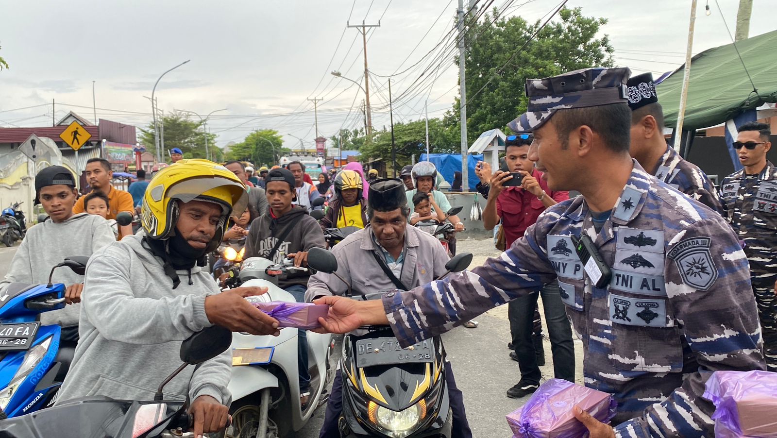 Menjelang waktu berbuka puasa, para prajurit tampak berbaur dengan masyarakat sembari membagikan paket takjil kepada pengemudi ojek, pedagang kaki lima, hingga warga yang masih beraktivitas di sekitar pelabuhan. Kehadiran prajurit TNI AL dengan senyum ramah dan sapaan hangat menciptakan suasana kebersamaan yang penuh keakraban di tengah masyarakat.