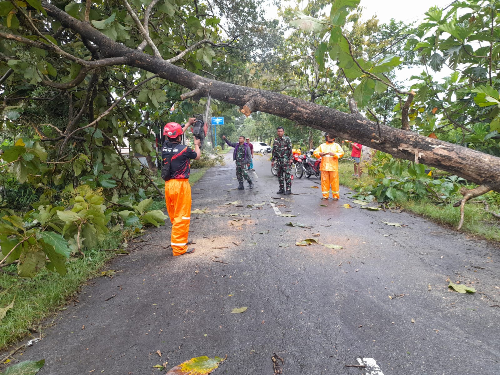 Ngawi — Polres Ngawi melalui Polsek Paron bergerak cepat melakukan pengamanan dan evakuasi pohon tumbang di Jalan Raya Paron, Desa Teguhan.