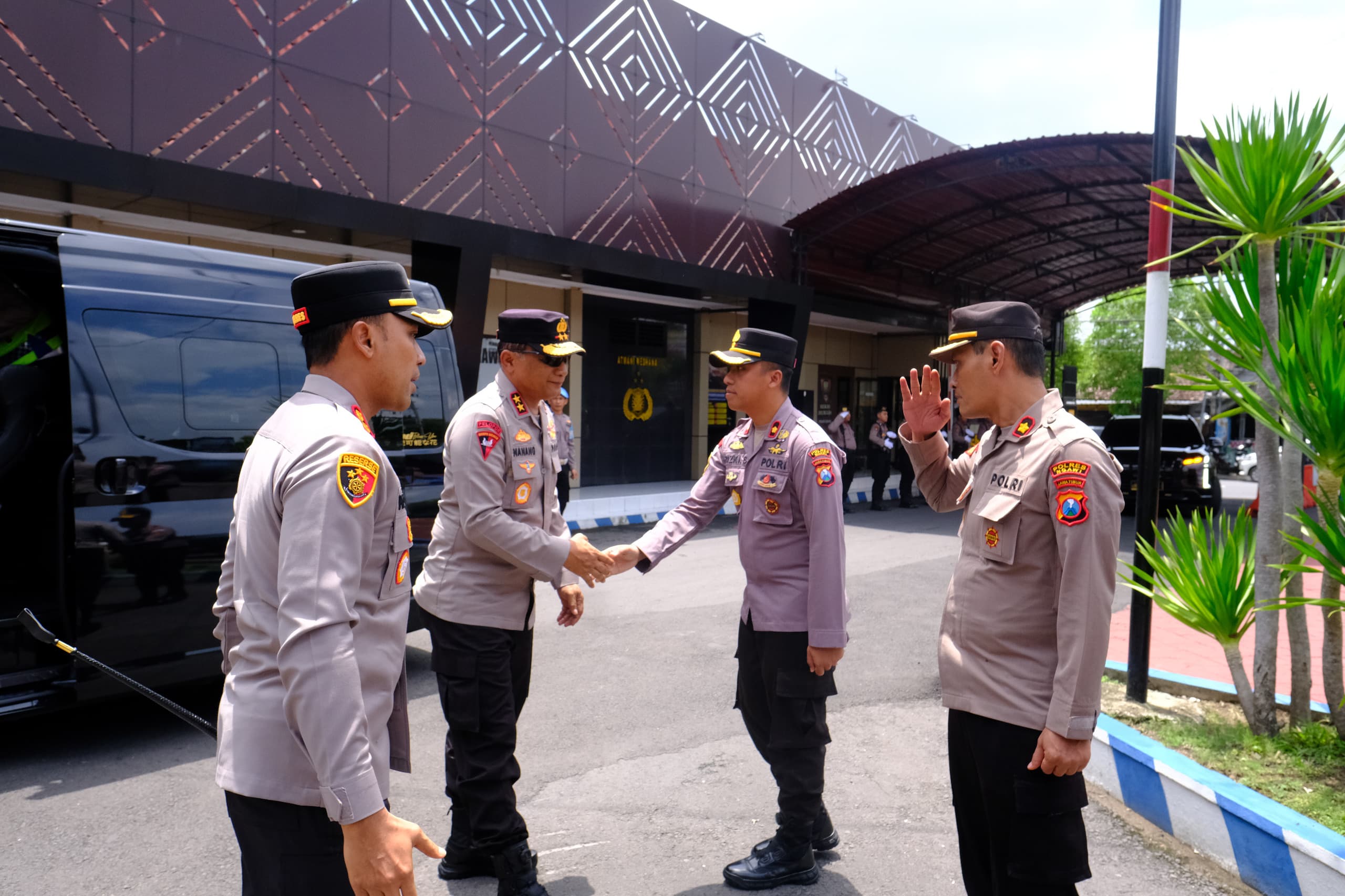Kedatangan Kapolda Jatim dan rombongan disambut langsung oleh Kapolres Ngawi AKBP Prayoga Angga Widyatama, S.I.K., M.Si. bersama para Pejabat Utama (PJU) Polres Ngawi.