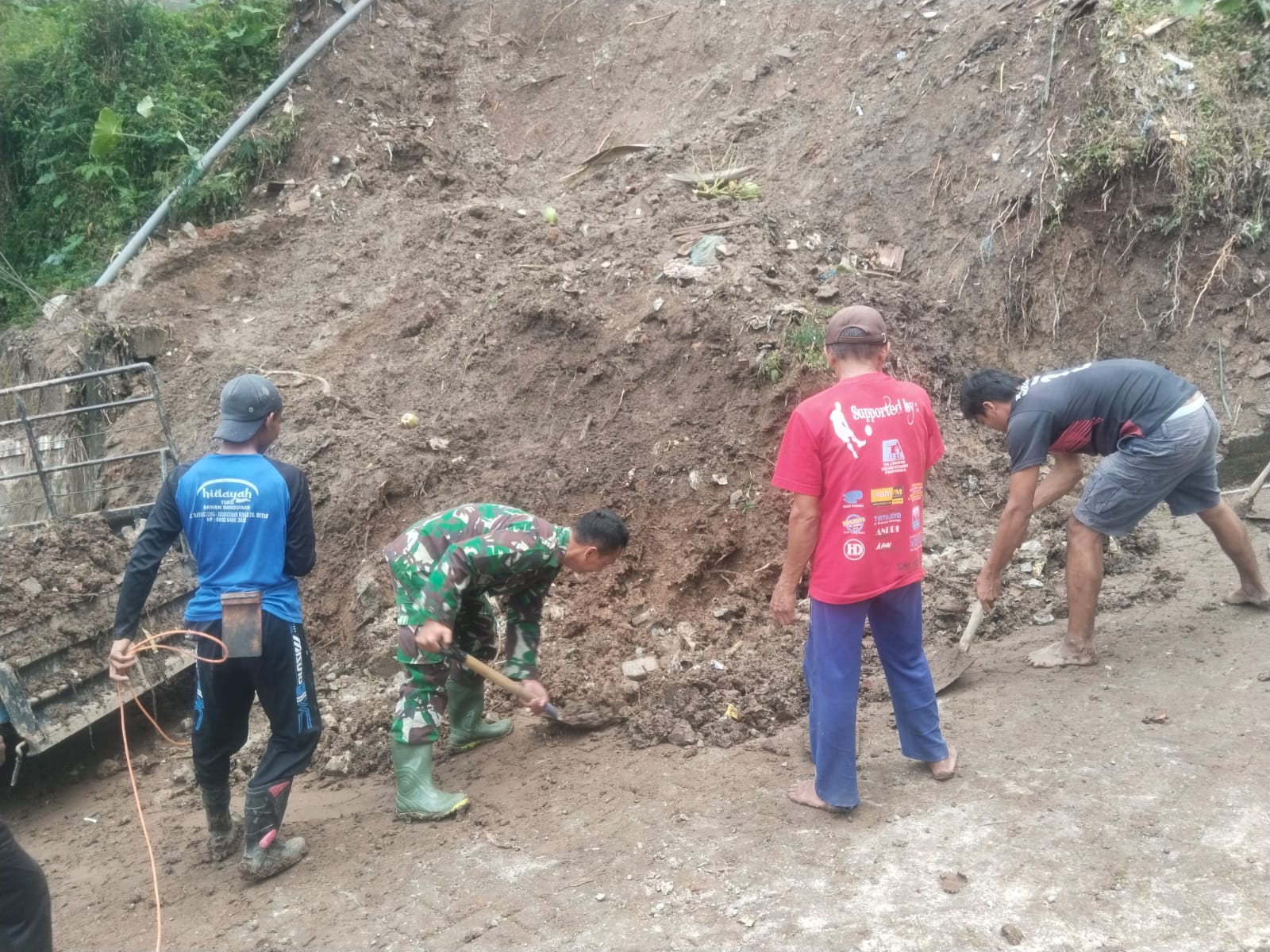 Tidak butuh waktu lama, setelah melaporkan kejadian ke Komando Atas dan berkoordinasi dengan aparat dan masyarakat setempat, Serda Eko S langsung melakukan kerja bakti membersihkan tanah yang menutup jalan.