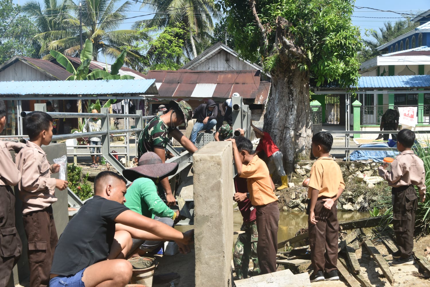 Partisipasi masyarakat, termasuk anak-anak yang turut menyaksikan proses pembangunan, menjadi bukti nyata kedekatan TNI dengan rakyat.